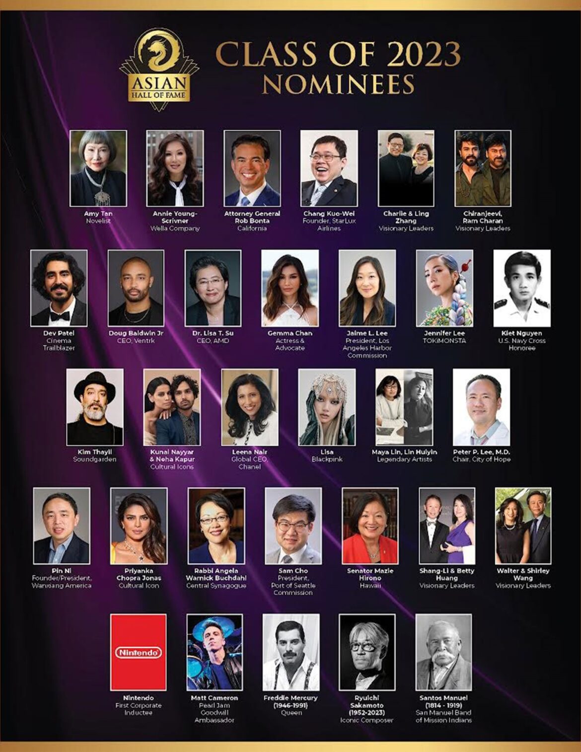 Over 500 Asian, multiracial, and indigenous luminaries were presented by an international nominating body. Nominees include novelist Amy Tan, CEO of AMD Dr. Lisa T. Su, automotive titan Pin Ni, music producer TOKiMONSTA, visionary leaders Charlie and Ling Zhang, amongst others. California Attorney General Rob Bonta was nominated by Inductees Norm Mineta and Major General Tony Taguba. CEO of Wella Company Annie Young-Scrivner was nominated by Inductee Indra Nooyi. Doug Baldwin Jr, CEO of Ventrk was nominated by Global Council Founder Seattle Seahawks. Nintendo is the first corporation nominated.